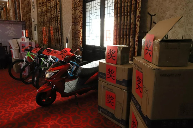 晚會進行期間,各種獎項輪番上陣,驚喜不斷,電瓶車、自行車、磨毛四件套等大獎的抽取,將晚會掀起了一個又一個高潮,現(xiàn)場處處洋溢著喜慶氛圍。