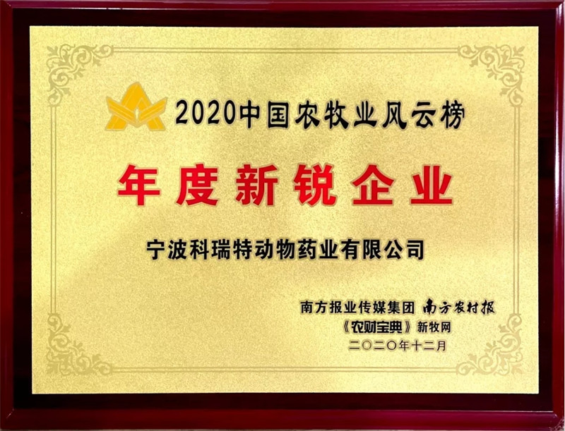 2020年12月11日,由南方報(bào)業(yè)傳媒集團(tuán)、南方農(nóng)村報(bào)社、廣東省鄉(xiāng)村振興文化服務(wù)產(chǎn)業(yè)園主辦,農(nóng)財(cái)寶典、新牧網(wǎng)、牛羊?qū)毜涑修k的中成藥業(yè)特約?2020第十屆中國(guó)農(nóng)牧業(yè)風(fēng)云會(huì)在廣州盛大舉行。經(jīng)過(guò)前期激烈的網(wǎng)絡(luò)投票,以及專(zhuān)家、金牌服務(wù)商、協(xié)會(huì)、種豬場(chǎng)評(píng)委綜合評(píng)選,寧波科瑞特動(dòng)物藥業(yè)有限公司當(dāng)選2020年中國(guó)農(nóng)牧業(yè)風(fēng)云榜“年度新銳企業(yè)”。