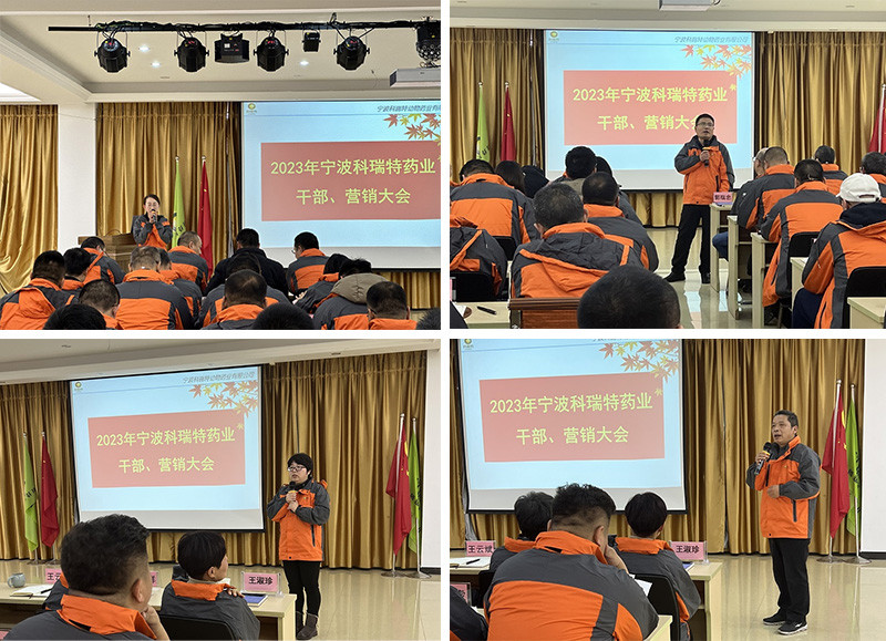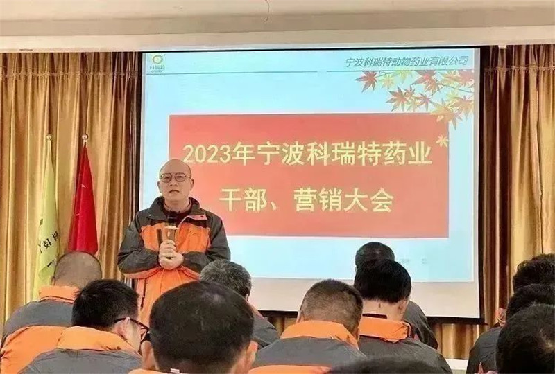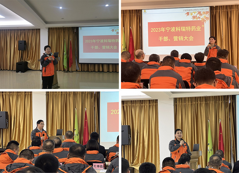 2023年1月31日-2月2日,寧波科瑞特動物藥業(yè)有限公司在寧波總公司召開“2023年度干部營銷大會”。董事長郭瑞忠先生、副董事長劉瓊鮮女士、總經(jīng)理王云斌先生會同全體銷售人員、公司職能部門負(fù)責(zé)人共同出席。