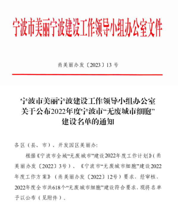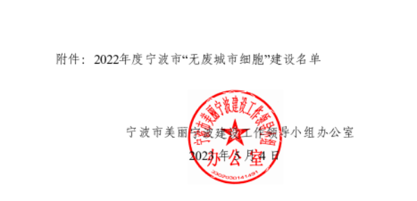 2023年5月4日,寧波市美麗寧波建設(shè)工作領(lǐng)導(dǎo)小組辦公室根據(jù)《寧波市全域“無廢城市”建設(shè)2022年度工作計劃》(甬美麗辦發(fā)【2022】3號)、《寧波市“無廢城市細胞”建設(shè)2022年度工作方案》(甬美麗辦發(fā)【2022】12號)要求,公布關(guān)于2022年度寧波市“無廢城市細胞”建設(shè)名單的通知。