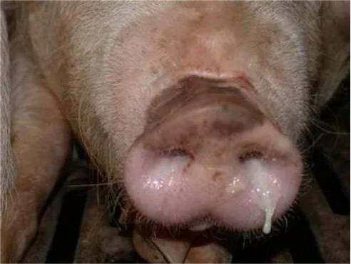 豬流感發(fā)病特征是突然發(fā)病,迅速傳播,很快漫延至全場。并以發(fā)熱、咳嗽、全身倦怠、鼻流大量清涕(后期轉(zhuǎn)為白色至鐵銹色濃涕,與繼發(fā)感染程度有關(guān))。