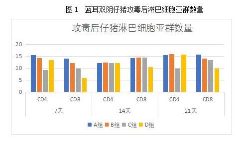 從試驗(yàn)結(jié)果可見,在攻毒、冷水和涼風(fēng)刺激的應(yīng)激條件下,免疫功能受到一定影響,包括陰性對照組在內(nèi)的各組免疫力在第14天達(dá)到低點(diǎn),但陰性對照組受到的影響最小,攻毒后第7天和第21天, CD4/CD8比值1.6以上,免疫功能基本處于正常狀態(tài),說明造成免疫抑制的主要因素是PRRSV攻毒。