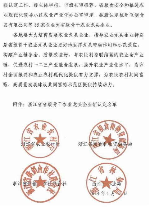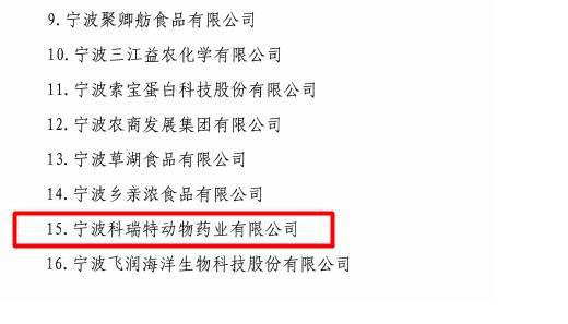 近日,根據(jù)《浙江省省級骨干農(nóng)業(yè)龍頭企業(yè)認(rèn)定和運(yùn)行監(jiān)測管理辦法》(浙農(nóng)產(chǎn)發(fā)〔2022〕5號)規(guī)定,經(jīng)主體申報(bào)、市級初審?fù)扑]、省糧食安全和推進(jìn)農(nóng) 業(yè)現(xiàn)代化領(lǐng)導(dǎo)小組農(nóng)業(yè)產(chǎn)業(yè)化辦公室審定,寧波科瑞特動物藥業(yè)有限公司成功認(rèn)定“省級骨干農(nóng)業(yè)龍頭企業(yè)”。