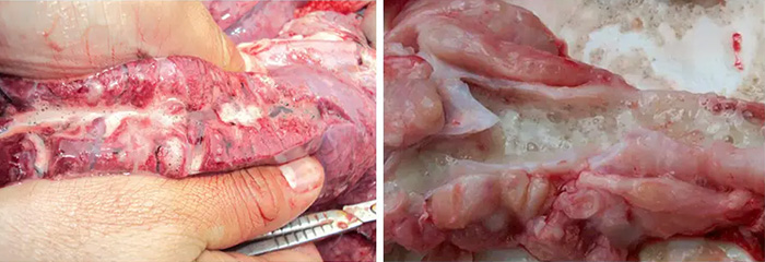 典型的豬流感特征為間質性肺炎,肺充血水腫,間質增寬,病變最常出現(xiàn)于肺的尖葉和心葉,與正常肺組織界限明顯。肺臟切面及氣管、支氣管中充滿泡沫狀滲出物。由于繼發(fā)感染,實際臨床上的解剖特征更復雜多變。