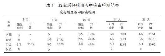 從試驗(yàn)結(jié)果可見:陰性對(duì)照組全程血清PRRSV CT值陰性,而陽(yáng)性對(duì)照組每3天有3頭陽(yáng)性,第7天全部轉(zhuǎn)為陽(yáng)性,說(shuō)明攻毒造模劑量是合適的。