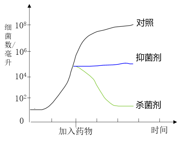 無論是殺菌劑還是抑菌劑,要想體現療效,還得有機體免疫力的參與,殺菌劑的劑量往往無法殺滅100%的病原微生物,抑菌劑則只是將病原微生物的數量控制在不增加,需要通過機體免疫系統清除剩余病原,疾病得以康復。如果沒有免疫系統參與,則一旦停藥,病原就會死灰復燃,再次猖獗。見圖。
