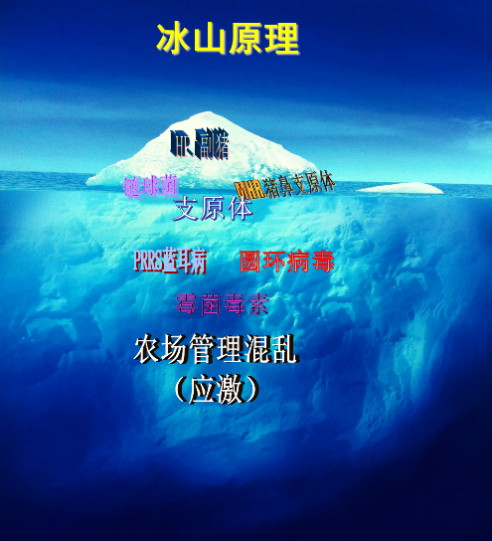 曾經盛行的一種說法,叫冰山理論,用來闡述細菌病與以上三大因素的關系。即海面上看到的冰山,只有其真實大小的20%(實際上根據冰與水的密度計算,遠不足20%),在海水的下面尚有80%。在豬病上的體現就是,你看到的副豬、鏈球菌、胸膜肺炎等細菌性病原,在疾病中重要性只占20%,發(fā)生這些疾病的根本原因(看不見的部分),其重要性占80%。而這80%,才是豬只健康管理的核心。