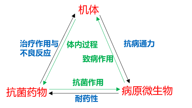 下圖描述了抗菌藥、機體和病原微生物三者之間的關系: